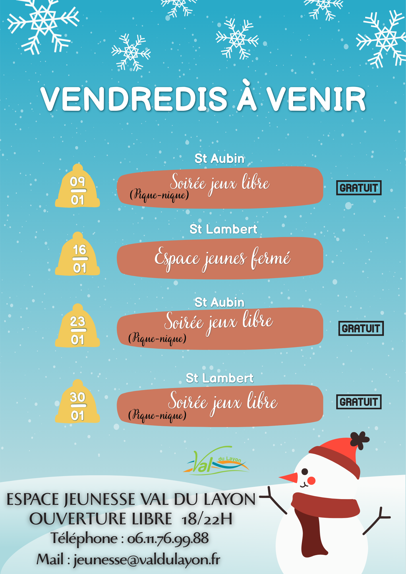 Les vendredis soir : accueil réservé aux jeunes de la 6ᵉ à la 3ᵉ (les élèves de CM2 ne sont pas concernés).
