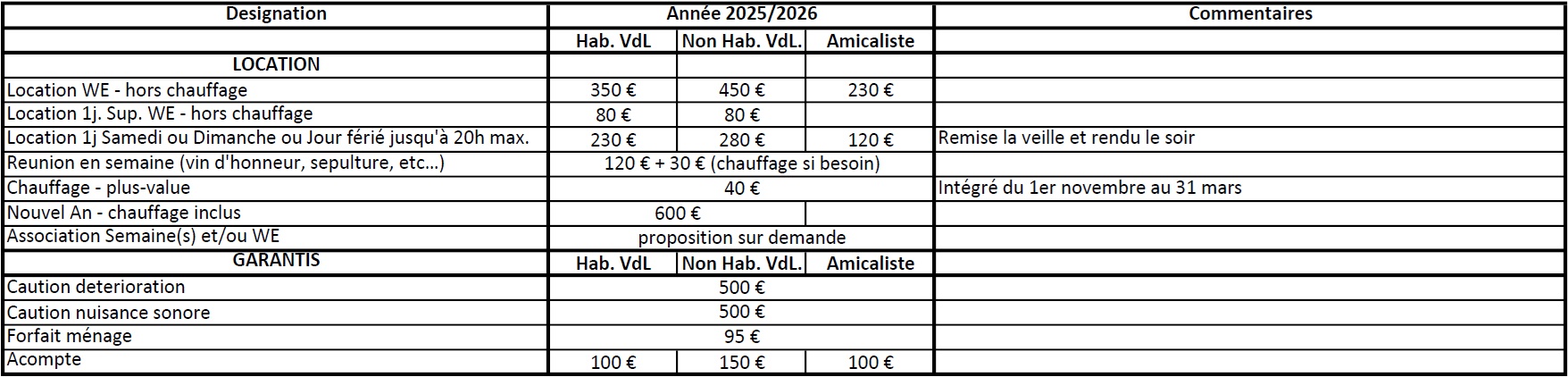 Tarifs des locations (à télécharger également ici)